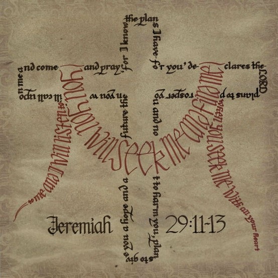 Jeremiah 29:11-13 (ESV) “For I know the plans I have for you, declares the LORD, plans for welfare and not for evil, to give you a future and a hope. Then you will call upon me and come and pray to me, and I will hear you. You will seek me and find me, when you seek me with all your heart.”